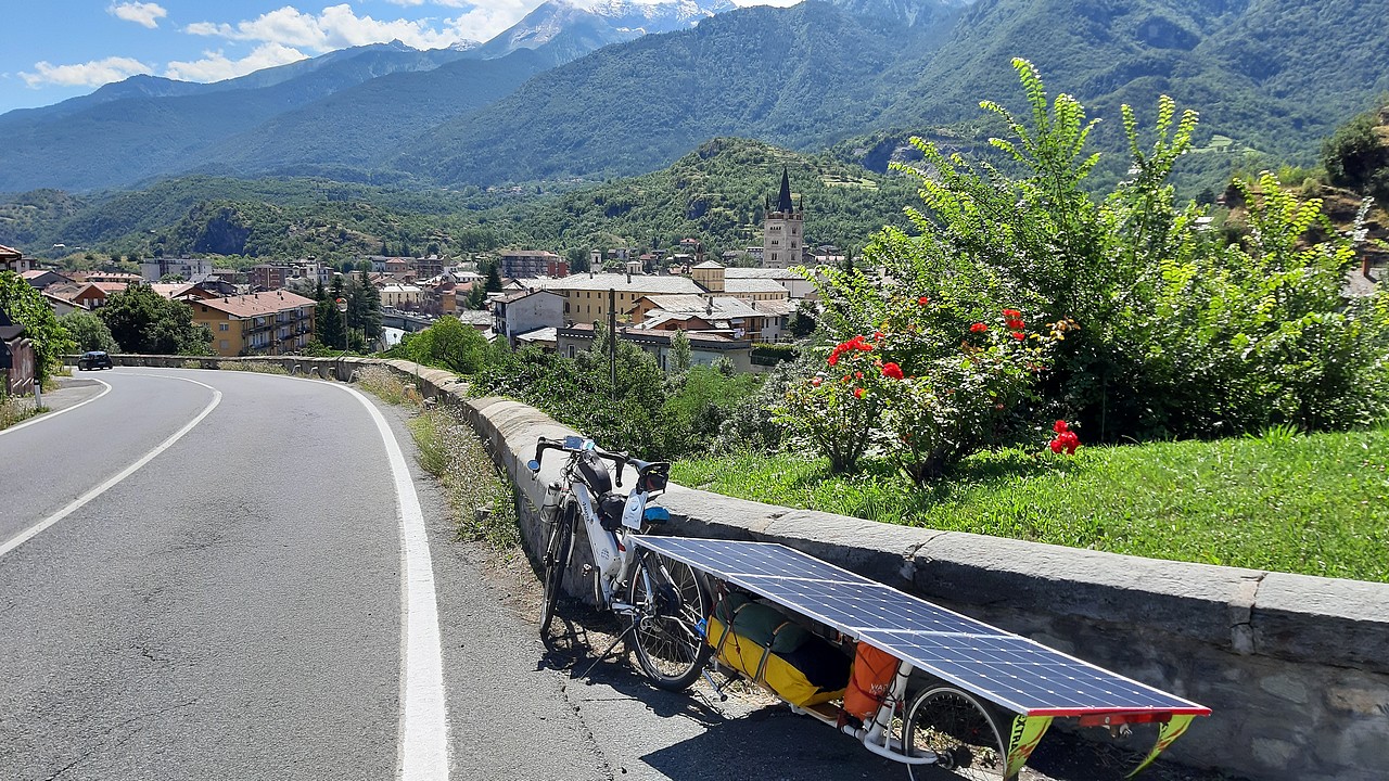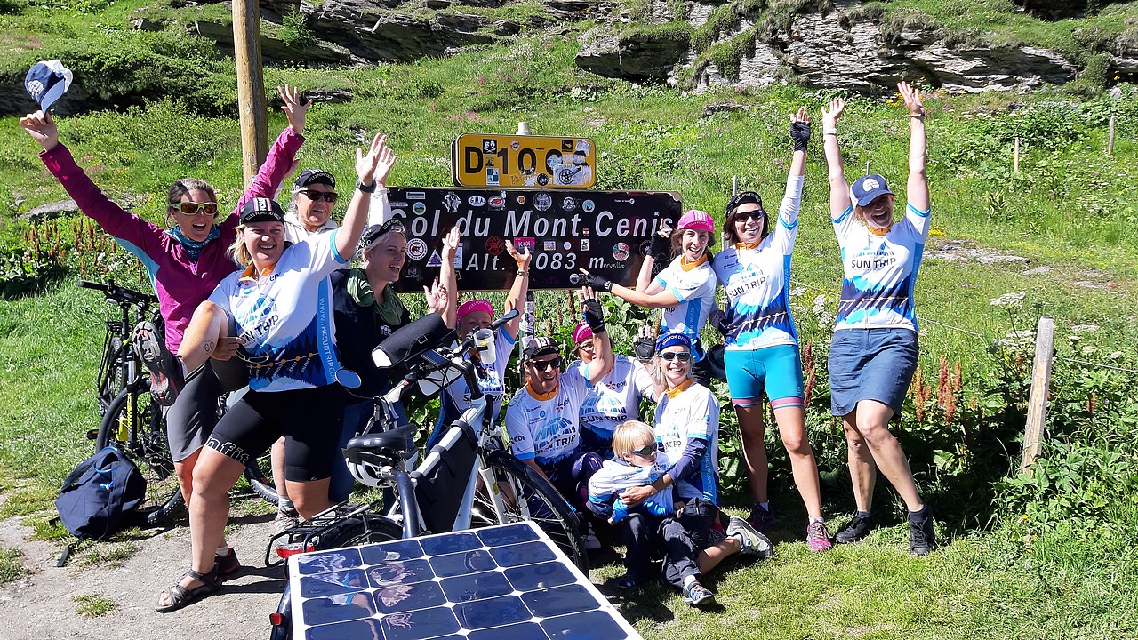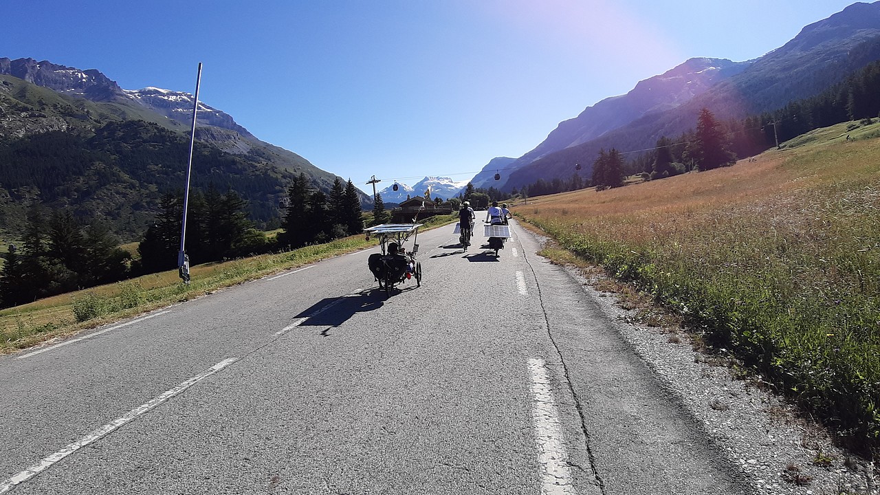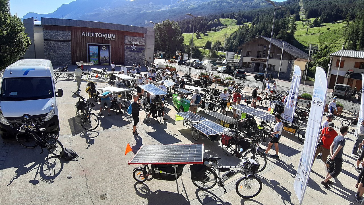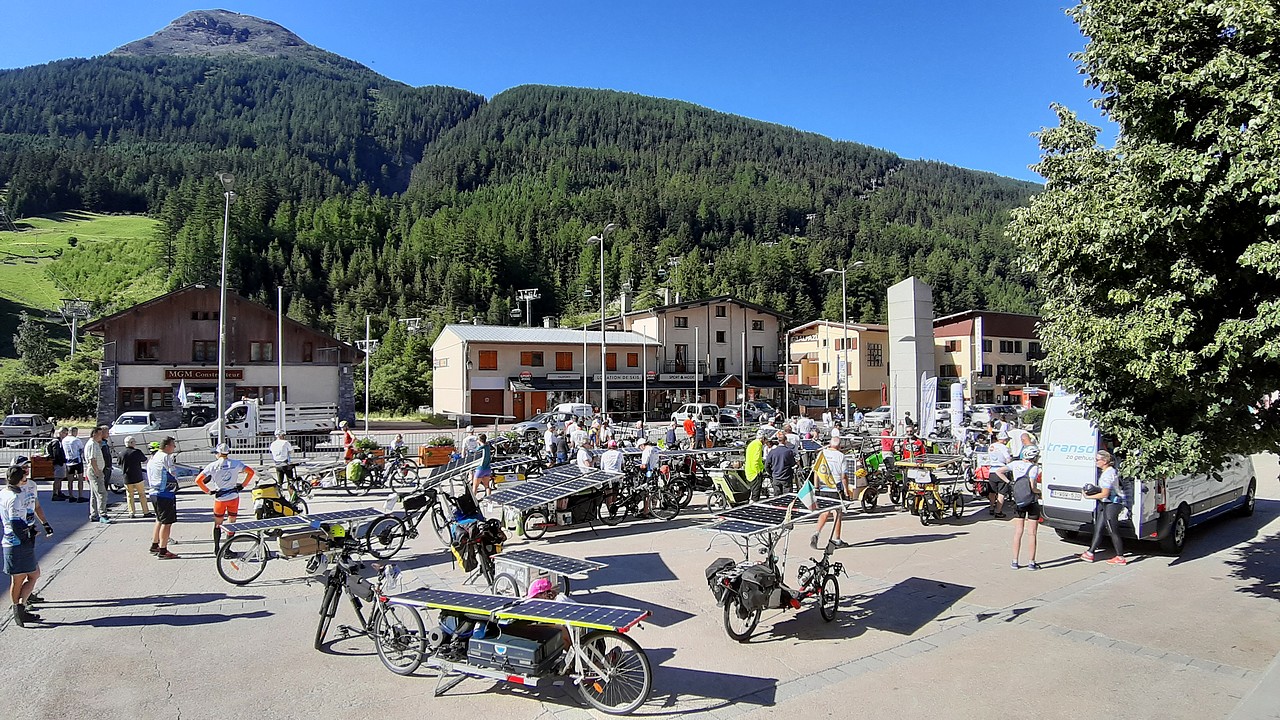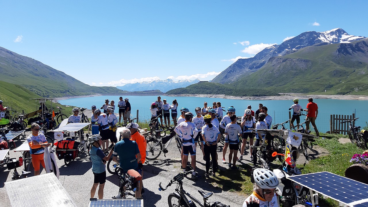 Ce matin, nous partons tous pour le Col du Mont Cenis, nous roulons groupés pour que l’agence Zeppelin puisse réaliser de belles images de l’ensemble des vélos solaires.