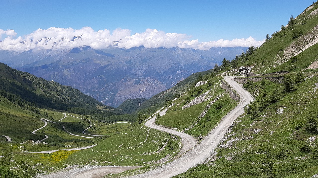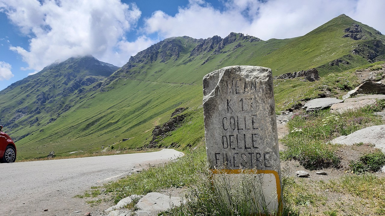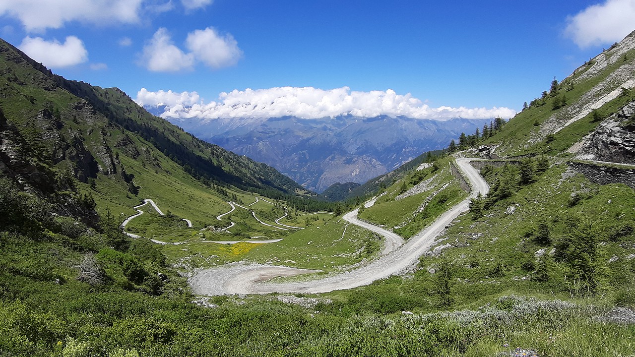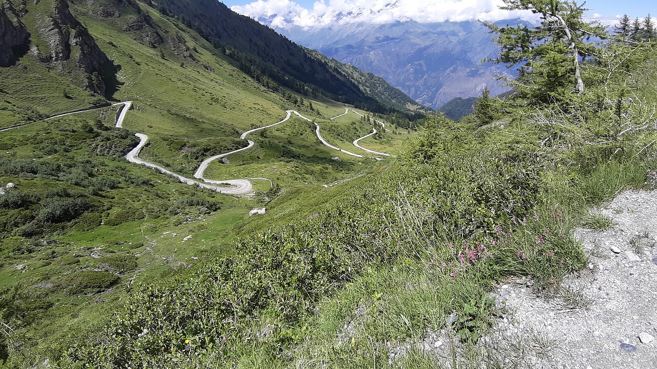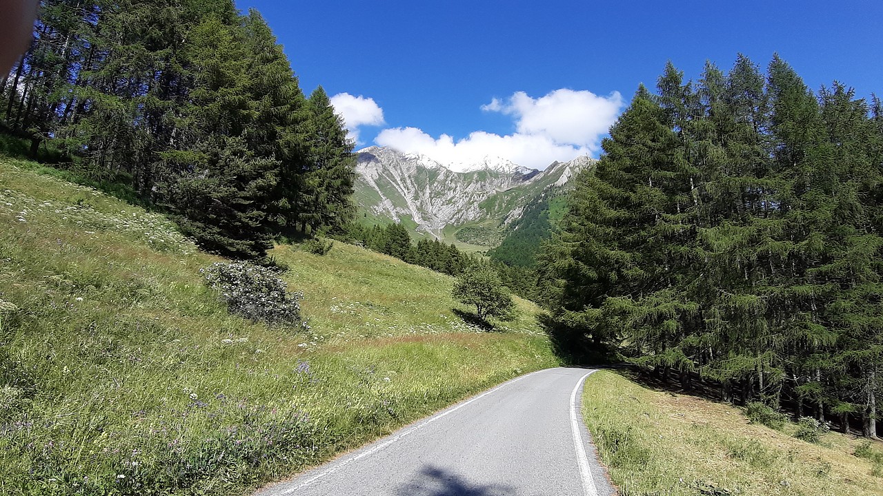 Là, les suntripeurs se séparent, les uns choisissent la vallée, les autres attaquent le col du Finestre. C’est aussi mon choix, je commence l’ascension en pleine chaleur. Heureusement, très vite la route dispense ses lacets dans un sous-bois bien frais. La contrepartie est l’absence de soleil sur les panneaux.