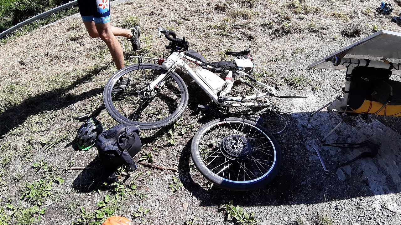 Je roule derrière Ralf qui monte avec une régularité d’horloger. Nous doublons Bertrand qui s’est arrêté pour laisser refroidir les moteurs de son vélomobile. Nous atteignons bientôt les alpages, la forêt s’éclaircit, nos panneaux captent à nouveau le soleil. Mais le bitume a disparu pour faire place à un chemin de terre. Une pelleteuse étale du sable pour réparer les dégâts d’un orage. Ralf s’ensable et doit pousser son vélo. Je passe, la route pour le sommet est libre.
