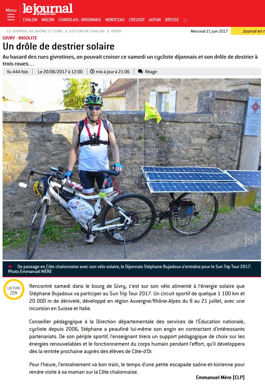 Am vergangenen Samstag fuhr ich in der Saône-et-Loire. Ich mache eine Pause in Givry, eine Person ist in meinem Fahrzeug interessiert, diskutieren wir Fahrrad und eine Reise. Er fragt, um mein Bild zu nehmen und… Ich finde heraus, dass er ein Reporter in der lokalen Zeitung ist!