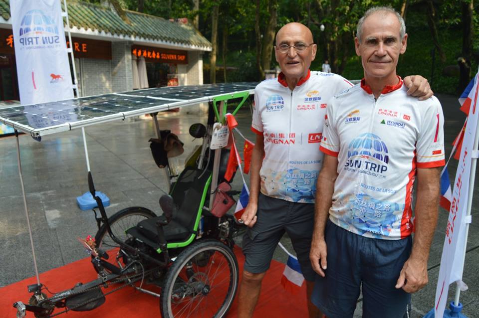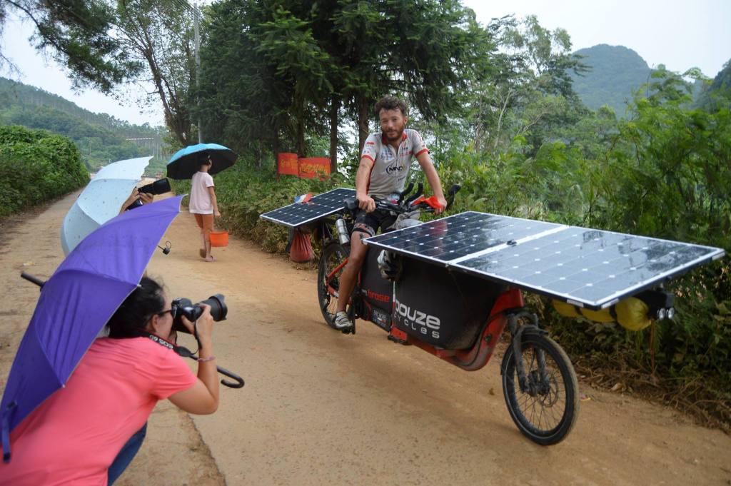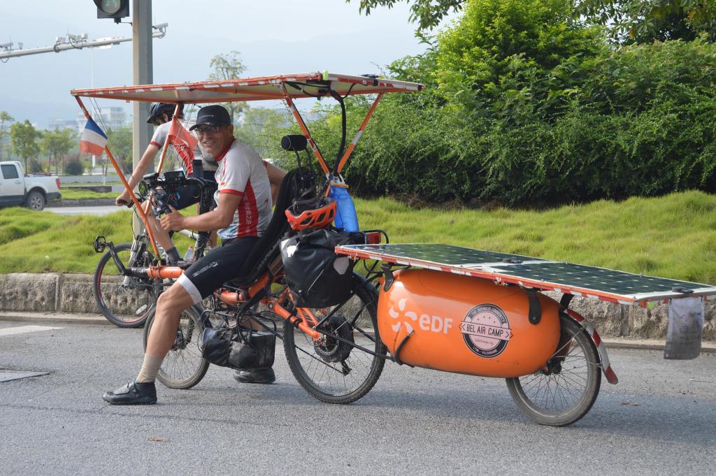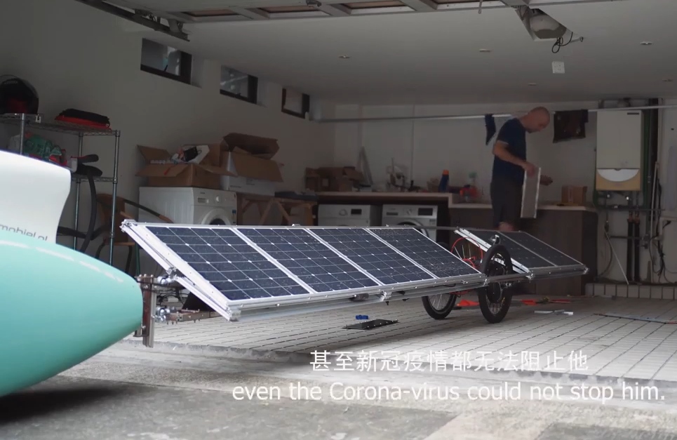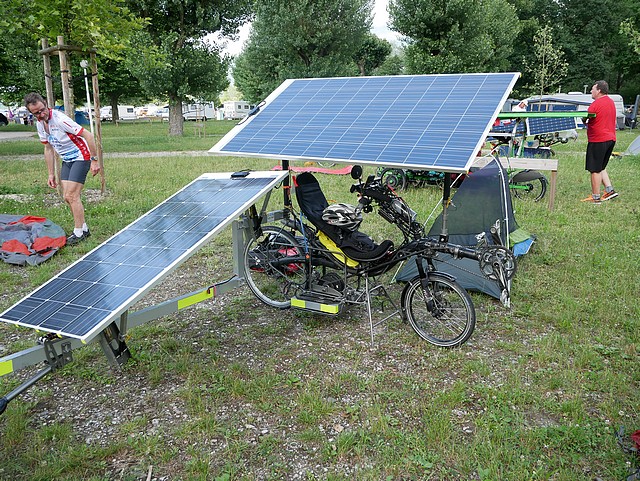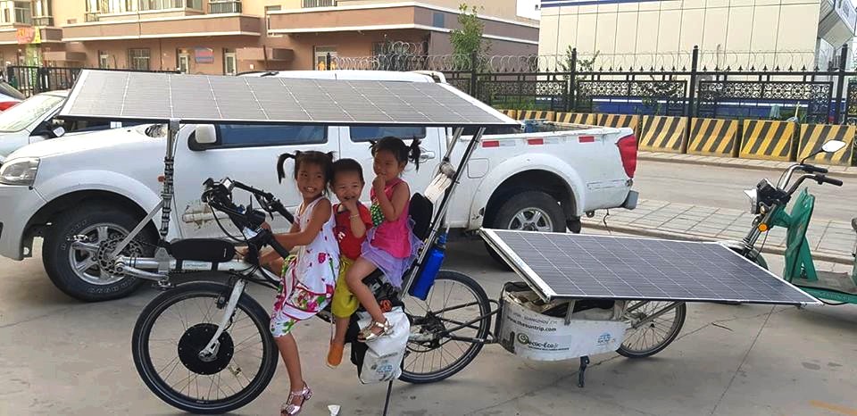 Sur les Sun Trip, les panneaux des vélomobiles sont toujours installés en toiture. Hors Sun Trip, Joerg Gebers a traversé la Chine en 2020 avec des panneaux sur une longue remorque très basse.