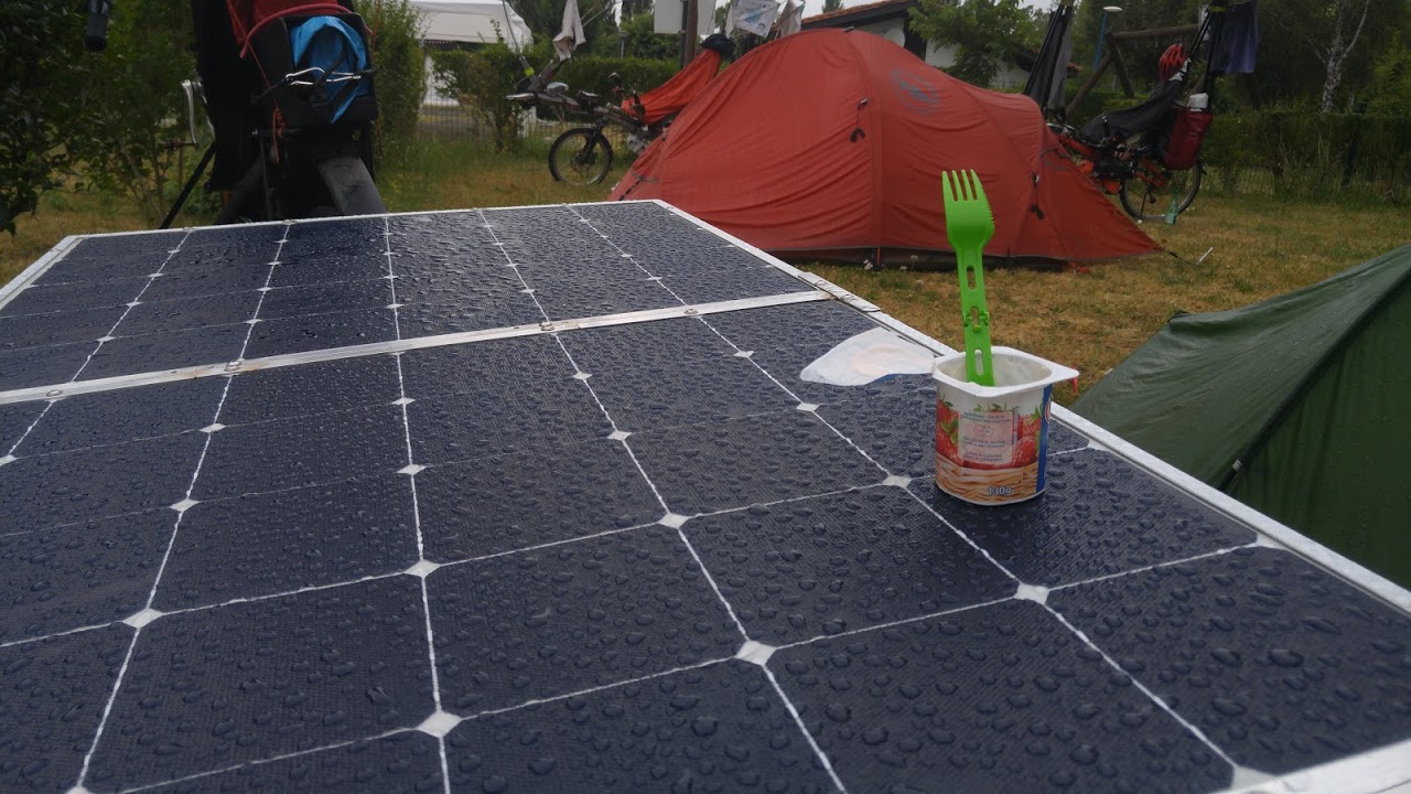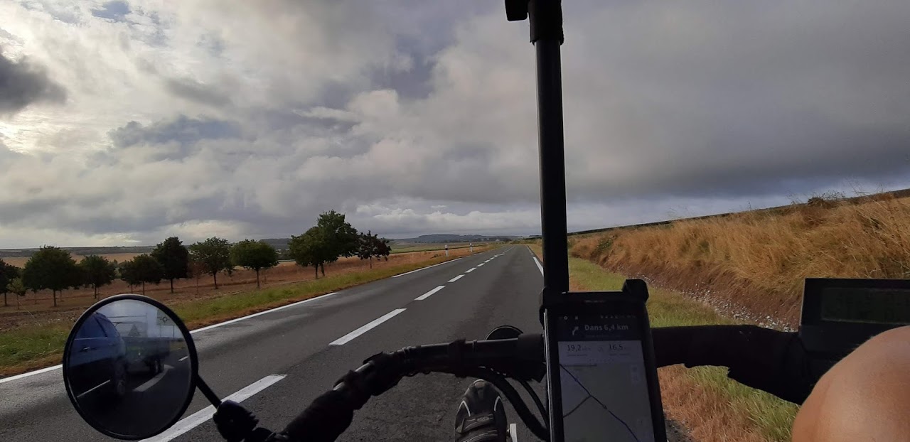 Je roule sous un ciel couvert, on sent que le soleil n’est pas loin. Parfois, il perce les nuages et la production solaire atteint 300W. Mais ses apparitions sont trop brèves et la production retombe, 40W, 15W, 7 Watts…