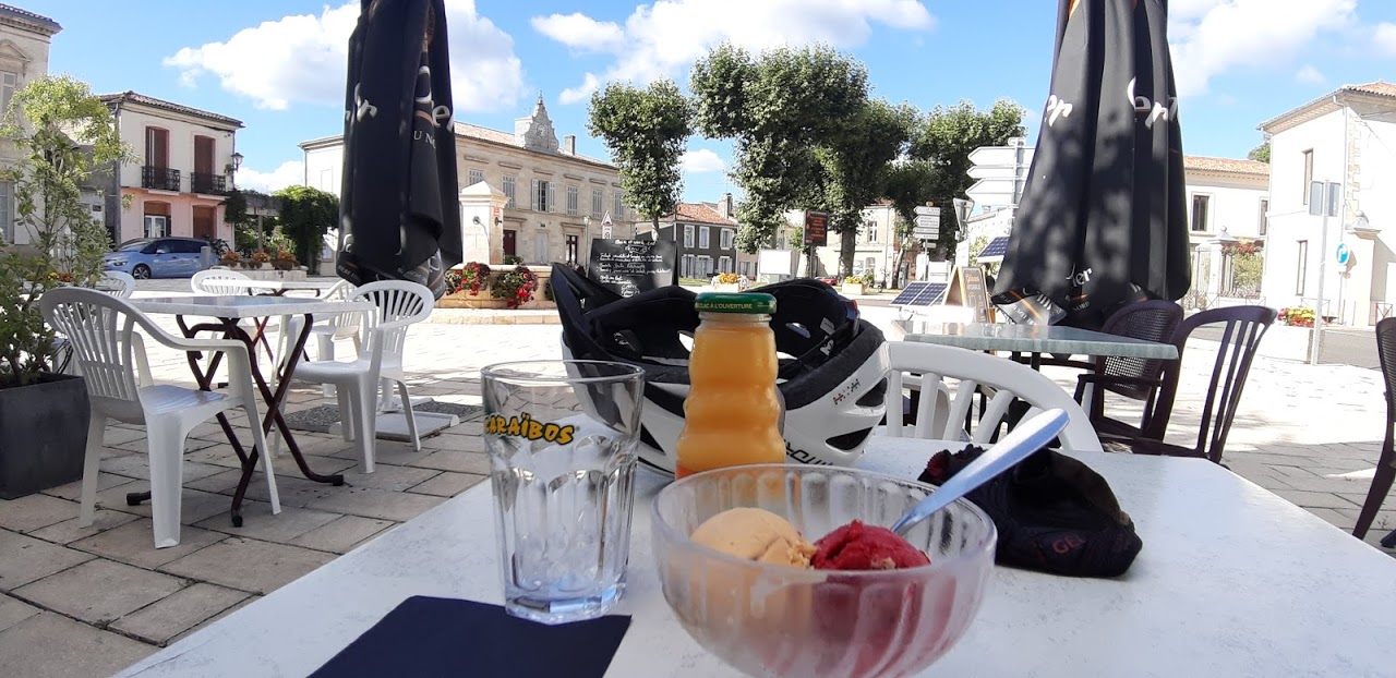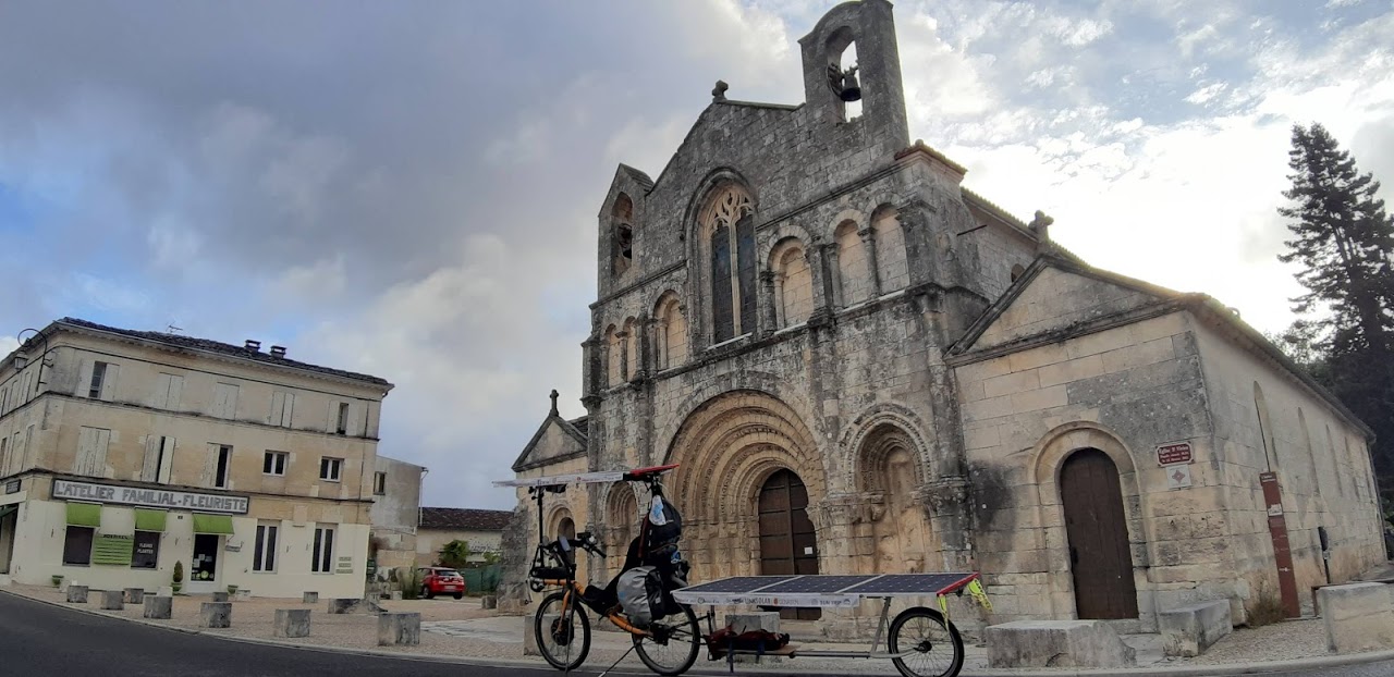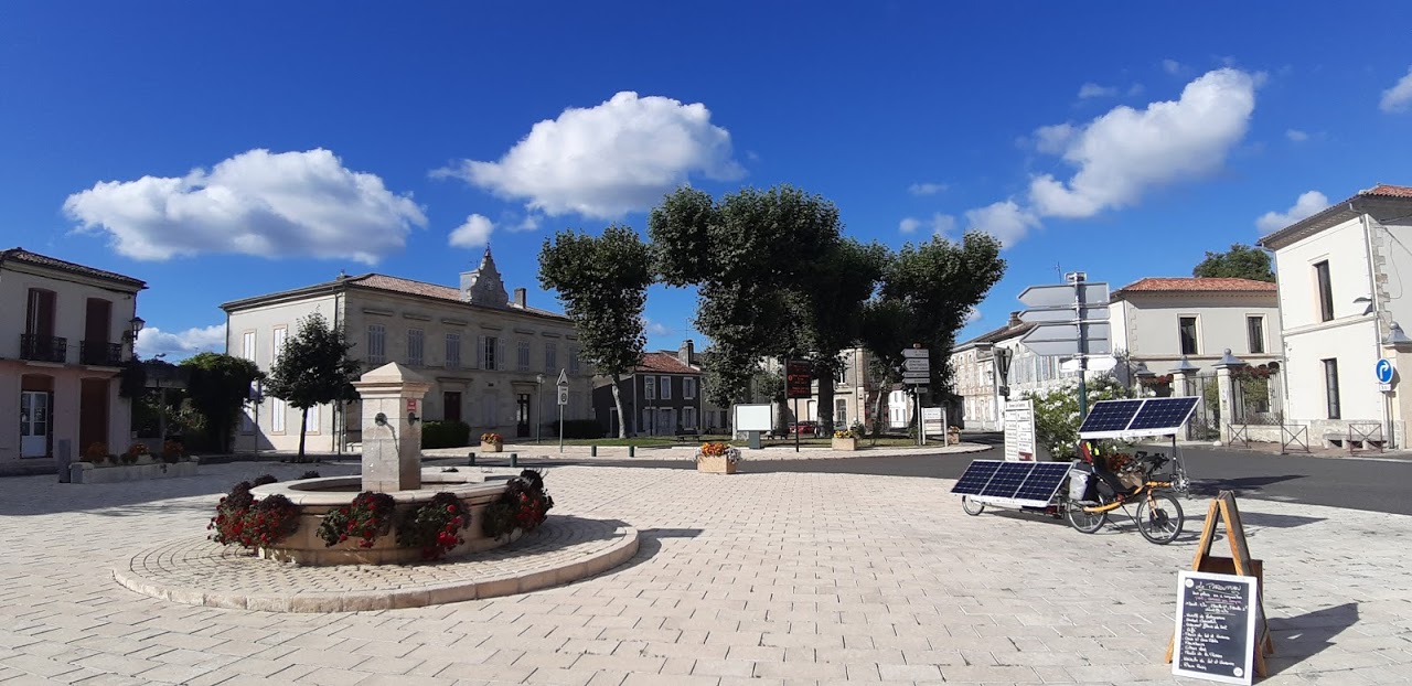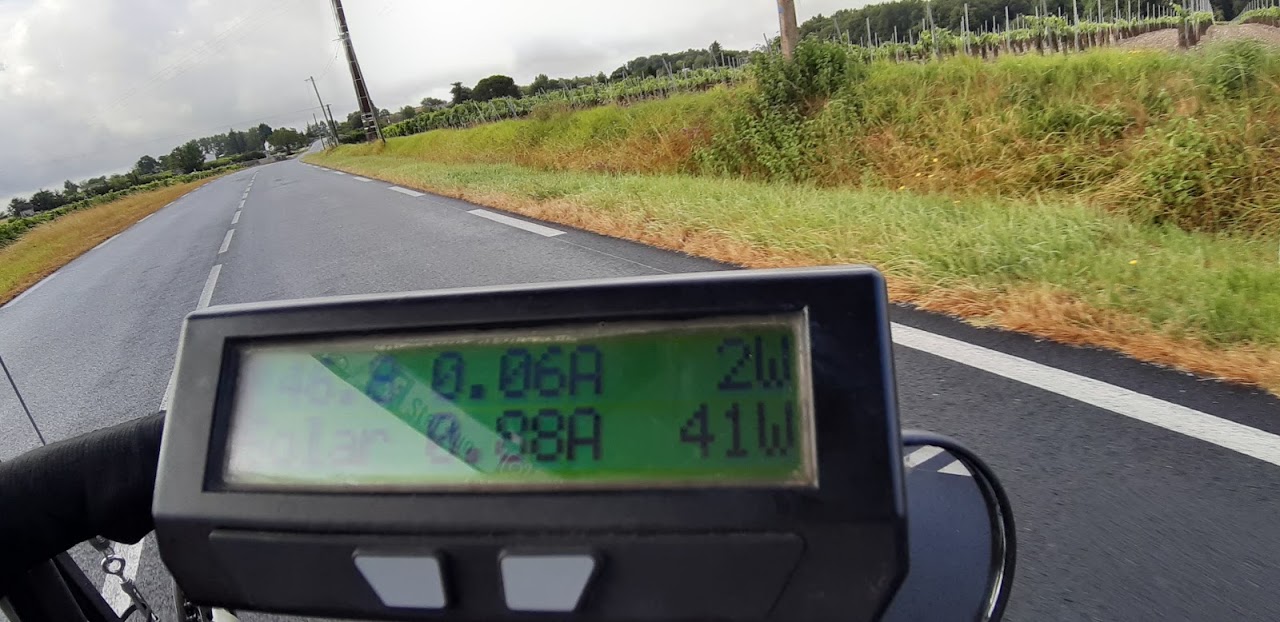 A Jonzac, ma batterie atteint un seuil critique (43V) et je ne pourrai pas continuer bien longtemps. Heureusement, à la sortie de la ville, le soleil apparaît franchement. Sauvé! Vite, j’installe le vélo sur le trottoir, j’oriente les panneaux. Quand la fenêtre de soleil se referme, j’ai capté presque 200 Wh. En route !
