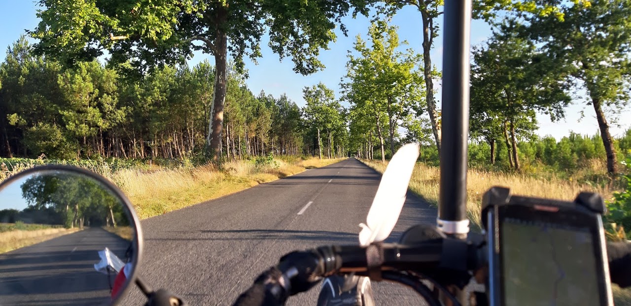 À partir de maintenant, le soleil ne me quittera plus. J’entre dans le Parc National des Landes, les routes sont très calmes, que du bonheur. Et quand les pins ne cachent pas le soleil, on atteint la perfection.
