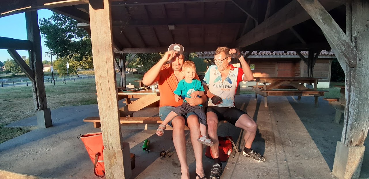 J’arrive à Brocas, je file au camping car il est bientôt 21h. À l’entrée, un homme m’interpelle. Surprise, c’est Johan qui rejoint le Sun Trip avec son fils Léon, 3 ans, sur leur tandem solaire!