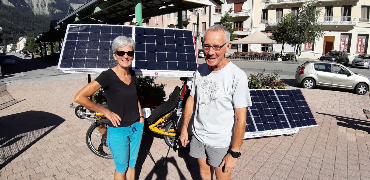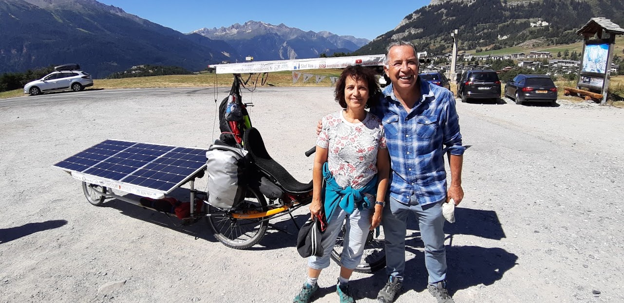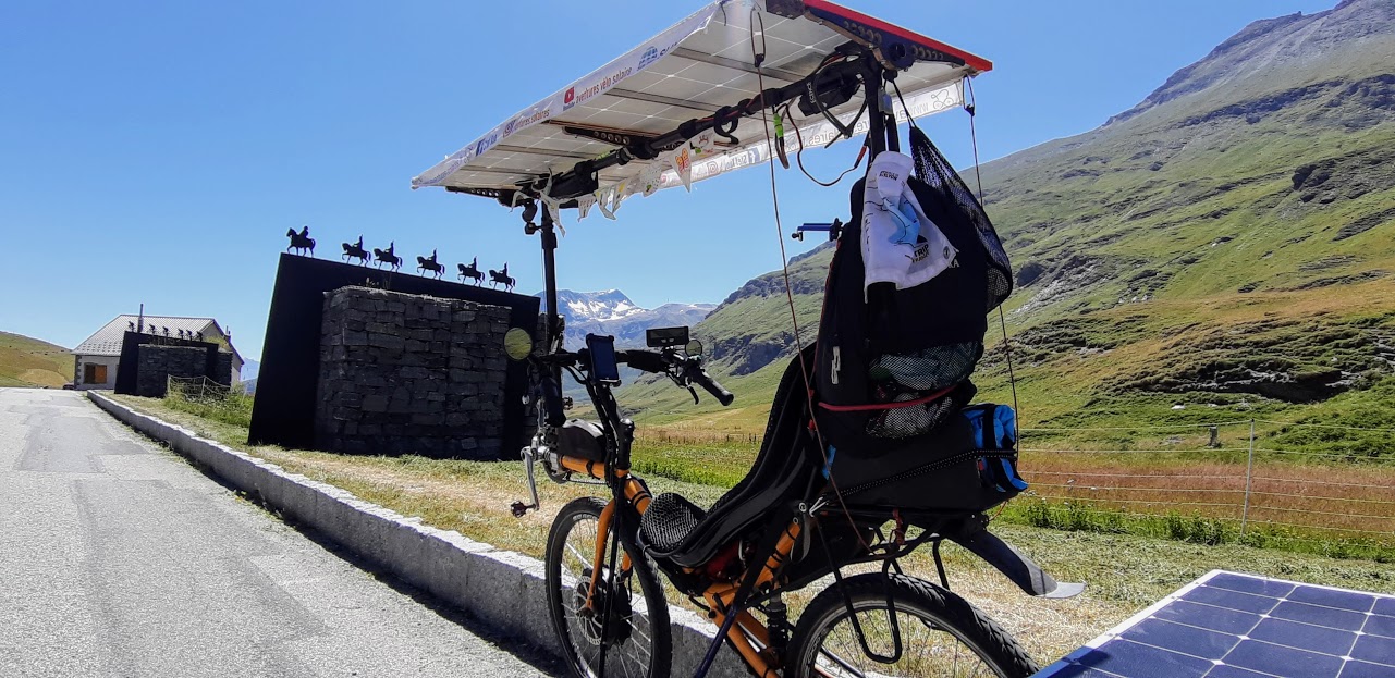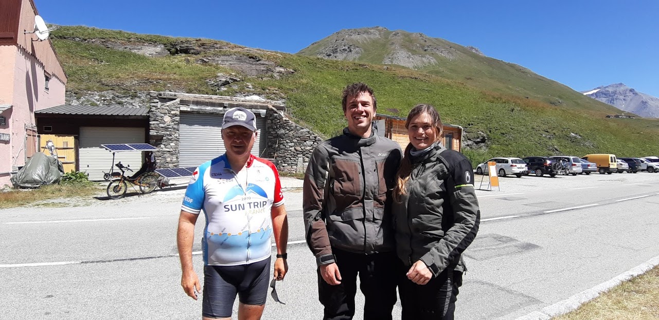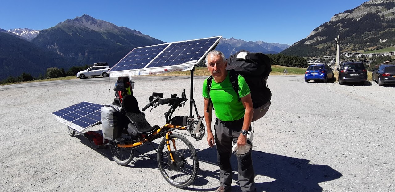 Mais heureusement après Modane, l’application Komoot me propose d’emprunter une petite route qui passe à Aussois. Je ne me fais pas prier. Certes, cet itinéraire grimpe sec, mais la vue est superbe. Petite pause à Aussois où je rencontre plein de monde, dont un élu de la commune qui connaît Florian Bailly, magie du Sun Trip!