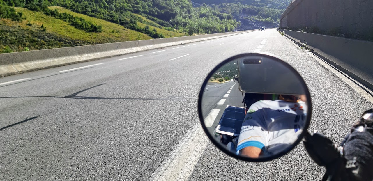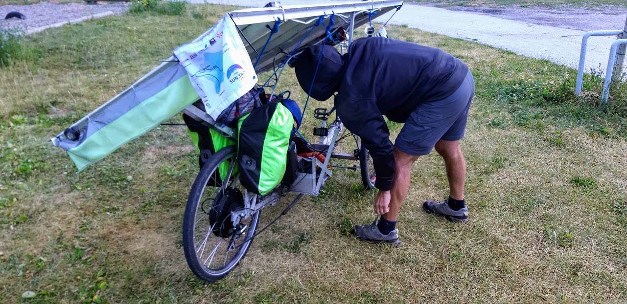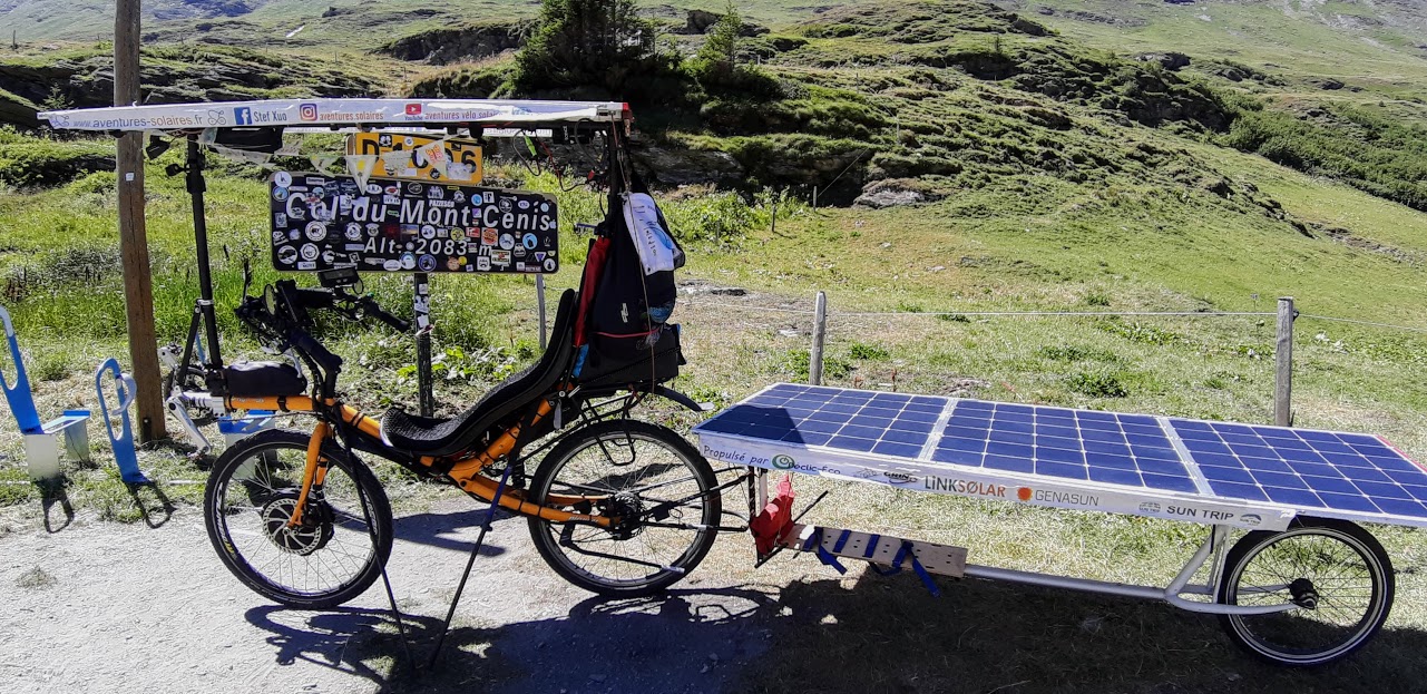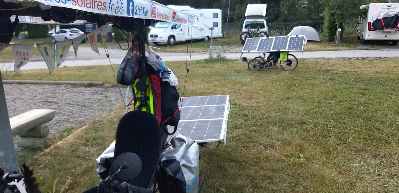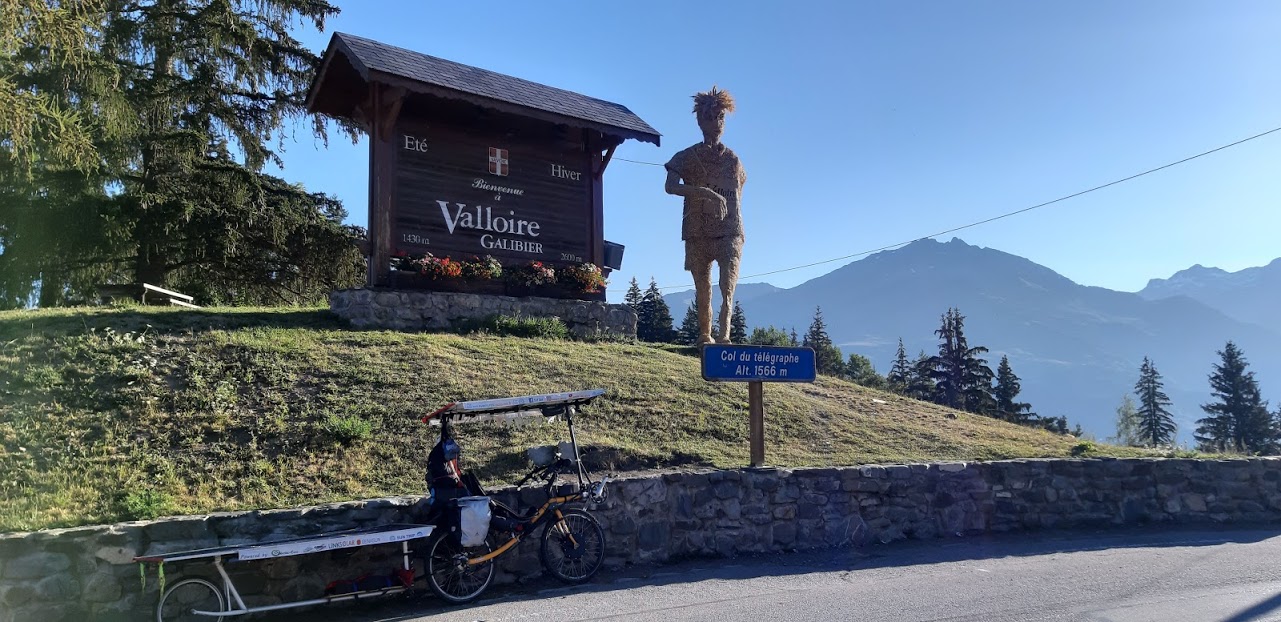 Mais heureusement après Modane, l’application Komoot me propose d’emprunter une petite route qui passe à Aussois. Je ne me fais pas prier. Certes, cet itinéraire grimpe sec, mais la vue est superbe. Petite pause à Aussois où je rencontre plein de monde, dont un élu de la commune qui connaît Florian Bailly, magie du Sun Trip!