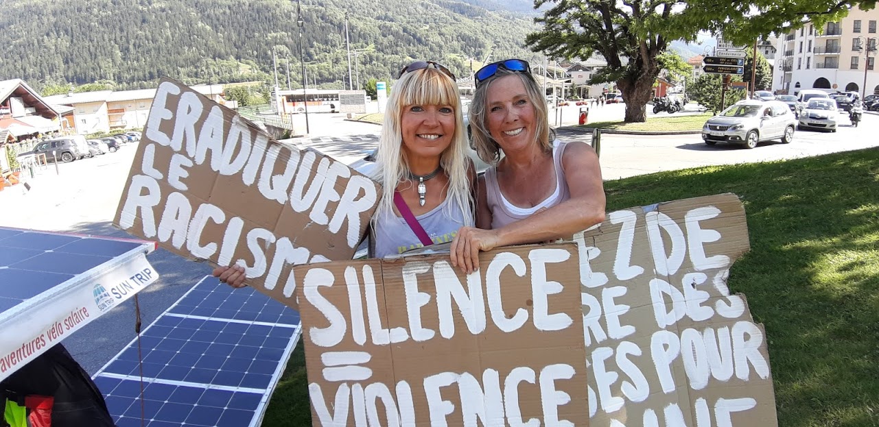 À Bourg-Saint-Maurice, rencontre avec Alexandra et Jill sur un rond point. Depuis 10 samedis, elles se mobilisent pour dénoncer les violences et le racisme. Elles rêvent d’un monde plus solidaire; elles disent qu’elles reçoivent beaucoup dans les échanges avec les gens.