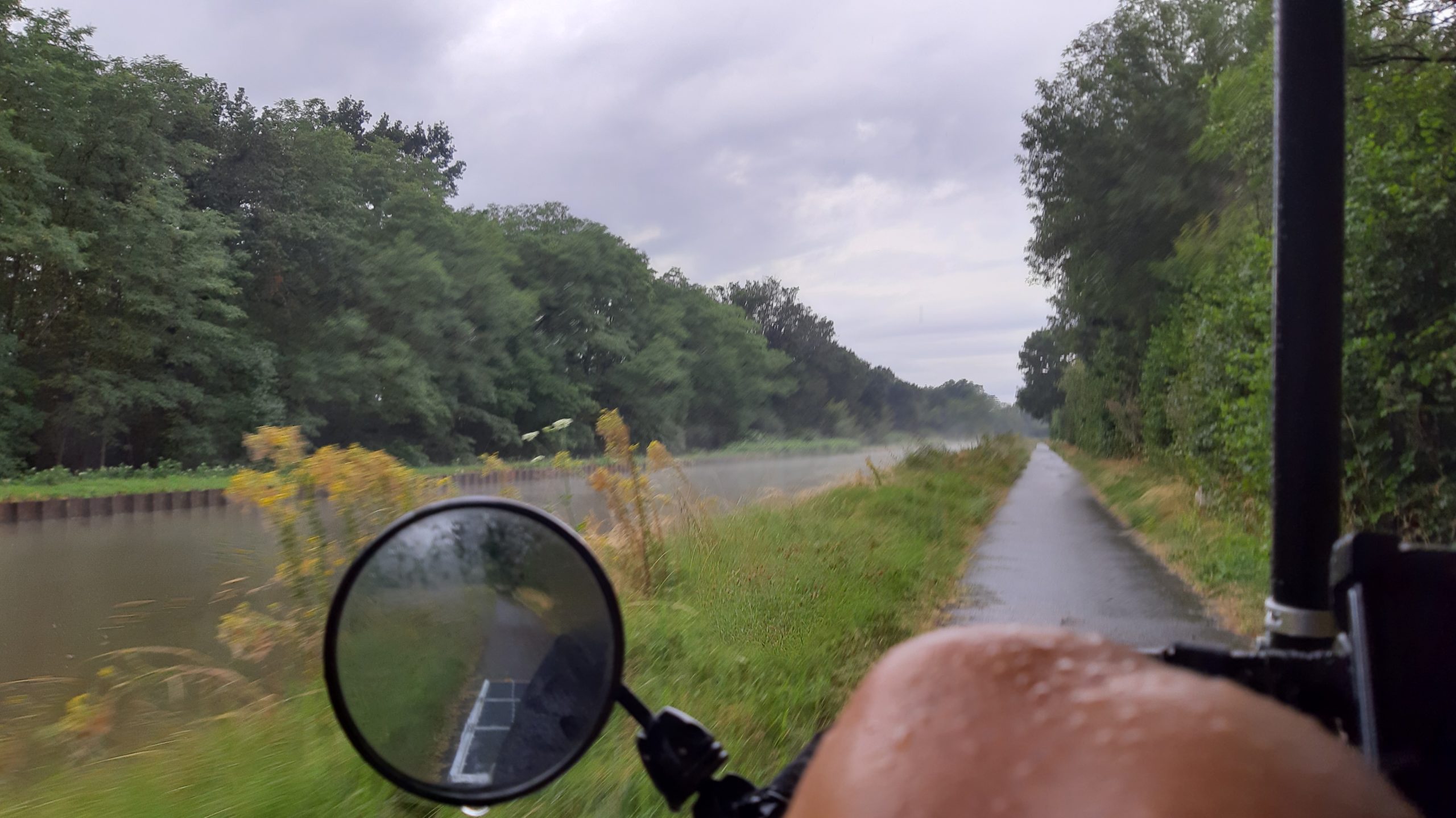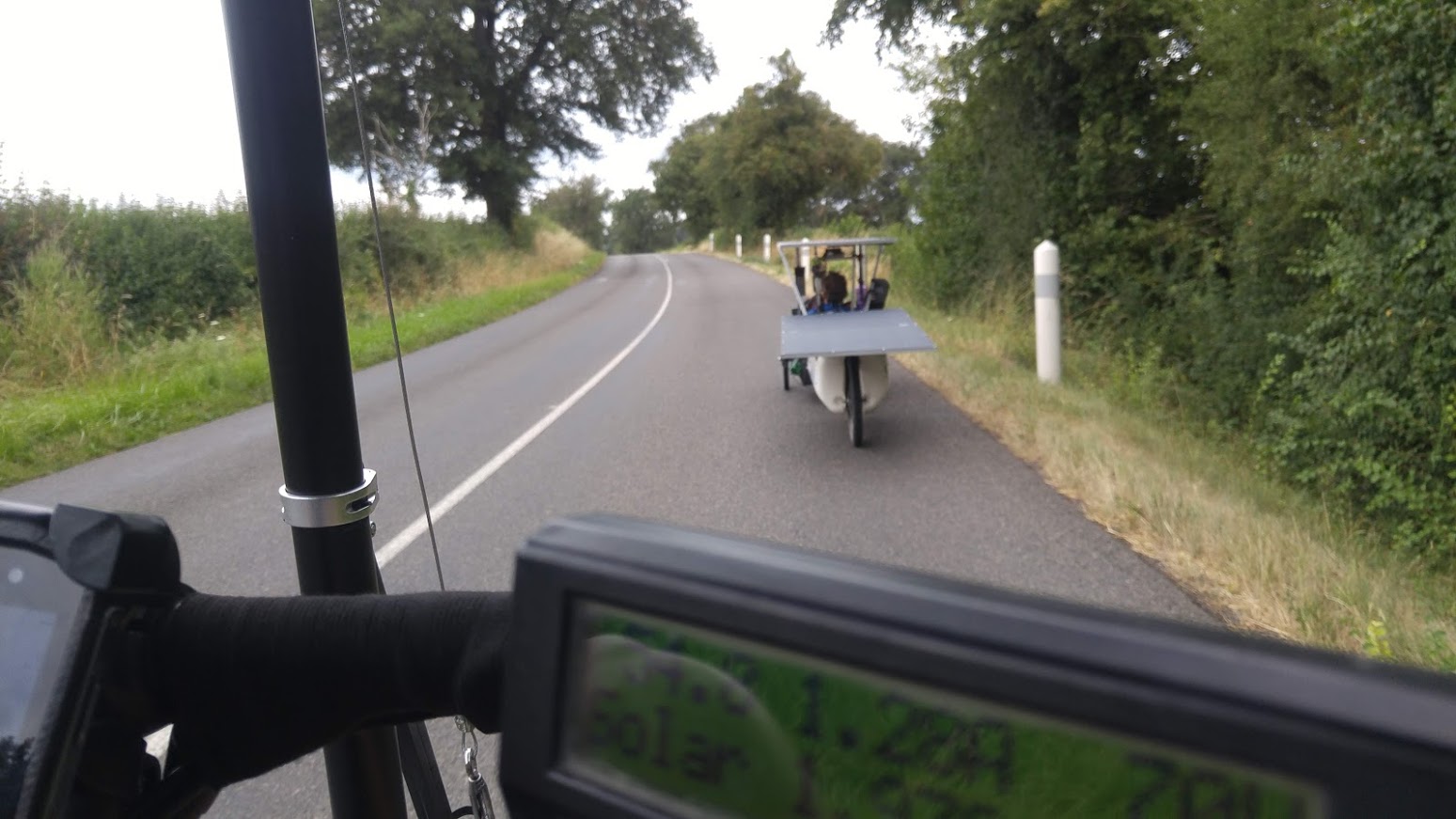 On le savait depuis hier: Florian nous avait annoncé que nous allions traverser une perturbation météo. Journée difficile pour des cyclistes solaires. Et effectivement, nous avons dû rouler sous la pluie, mais surtout réduire au minimum l’énergie consommée par notre moteur!