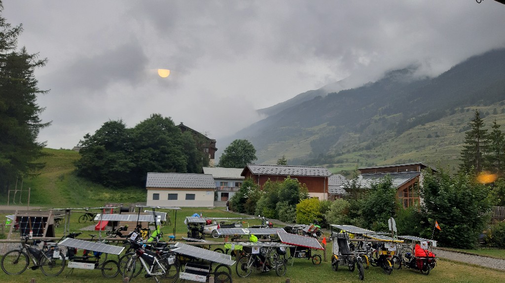 Les organisateurs du Sun Trip avaient prévu qu’aujourd’hui serait un jour de repos, et il se trouve qu’aujourd’hui, il pleut ici à Lanslebourg Val Cenis, le ciel est gris, les nuages s’accrochent aux montagnes. Nous les avons beaucoup applaudi les organisateurs pour ce tour de force !