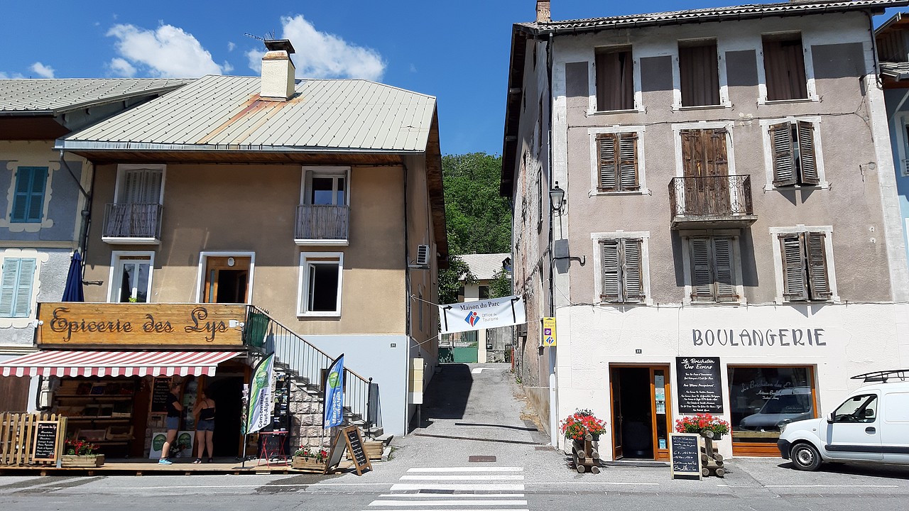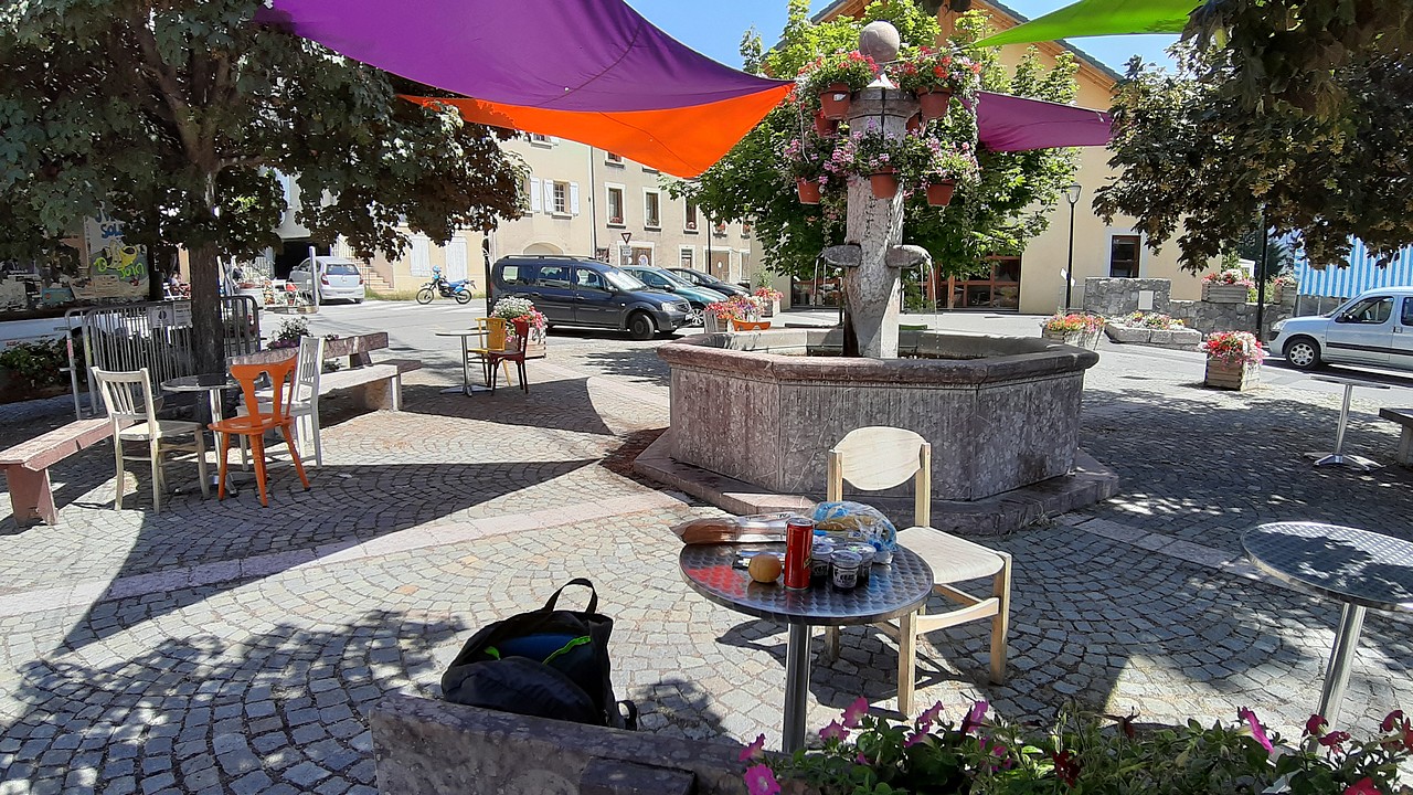 A midi, pause déjeuner à Châteauroux-les-Alpes un bourgade charmante qui sait accueillir le visiteur: la place centrale ombragée, les tables et les chaises de bistrot autour de la fontaine invitent les cyclistes à s’y installer et à consommer les produits locaux sélectionnés par la jeune épicière de l’Épicerie des Lys et le pain tout chaud du boulanger.