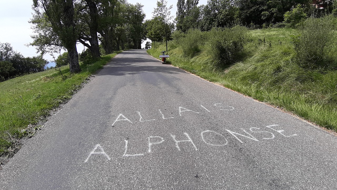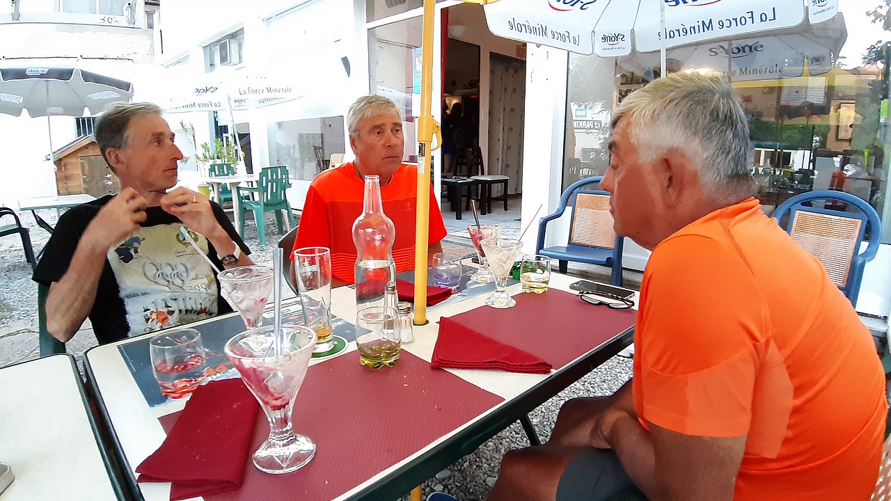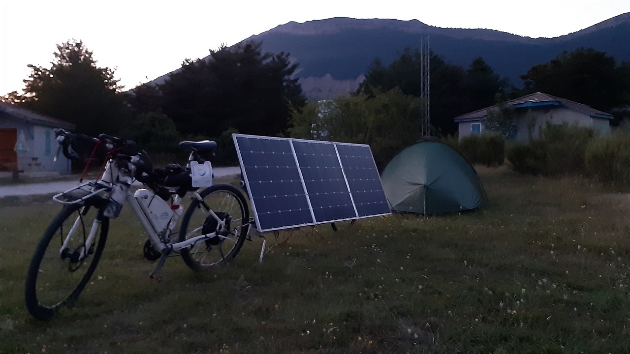Agréable camping en aire naturelle à Aspres-sur-Buëch. Dîner en ville avec Paul, Francis et Daniele. Avant de me coucher, je n’oublie pas d’orienter les panneaux vers le soleil levant!