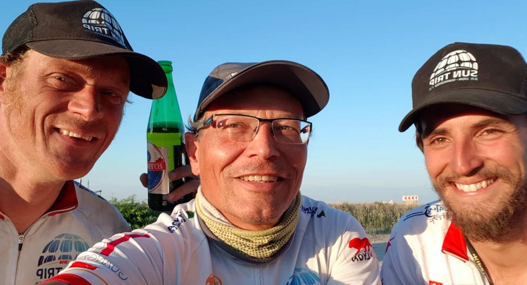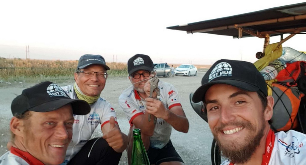 Vier suntripers waren glücklich, an der grenze zwischen Russland und Kasachstan zu treffen: