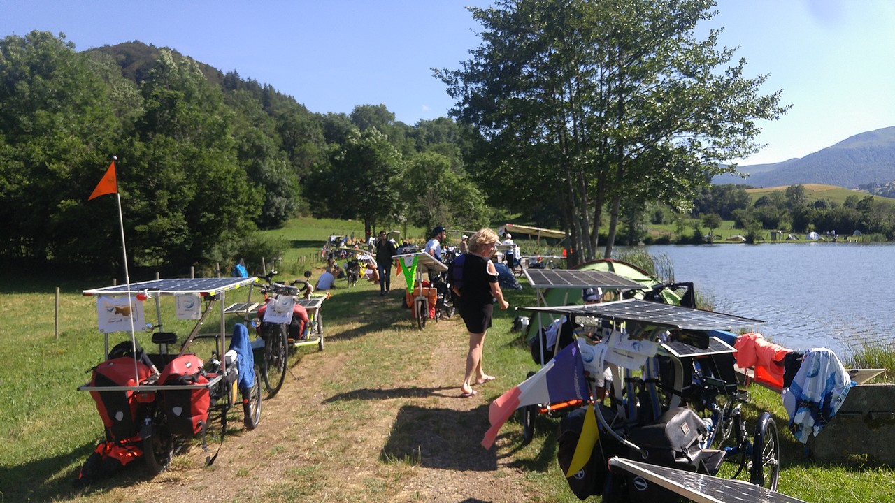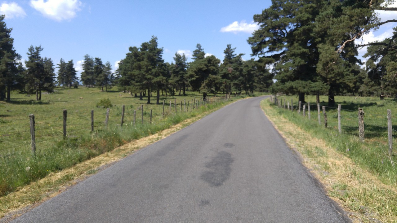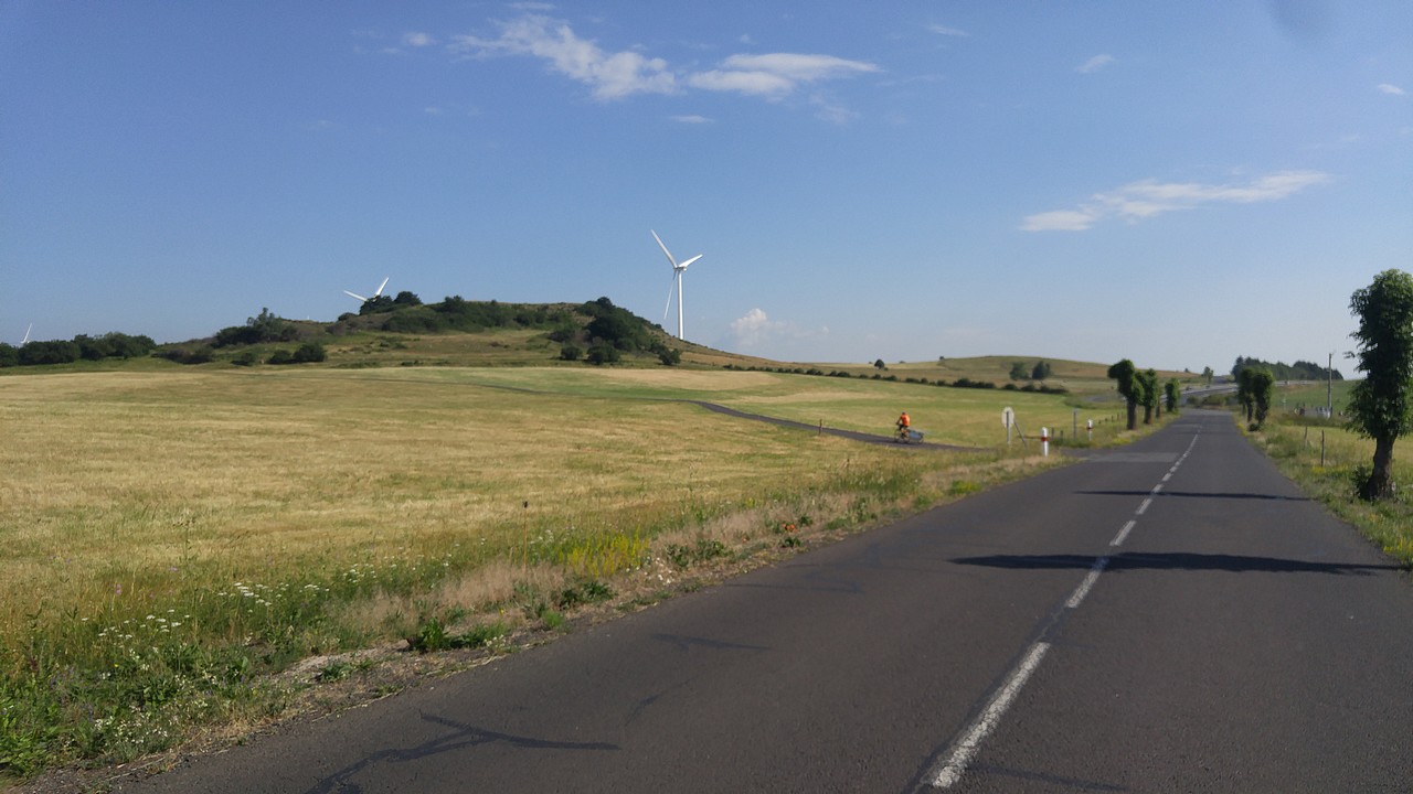 Today, the stage in Cantal is short, without significant elevation. We cross wild landscapes, villages with old houses in volcanic stone in various shades, from warm brown to gray. I think of the times when these villages were populated and productive, around agriculture, handicrafts and small industries. My bike pulls me from my daydreams, he recalls to me: the brakes work less and less well, despite the pad sanding done this morning. I am forced to brake with the foot and it heats strongly in the shoe!