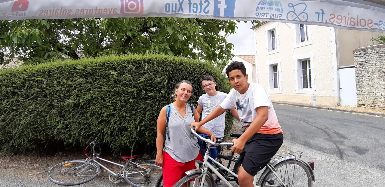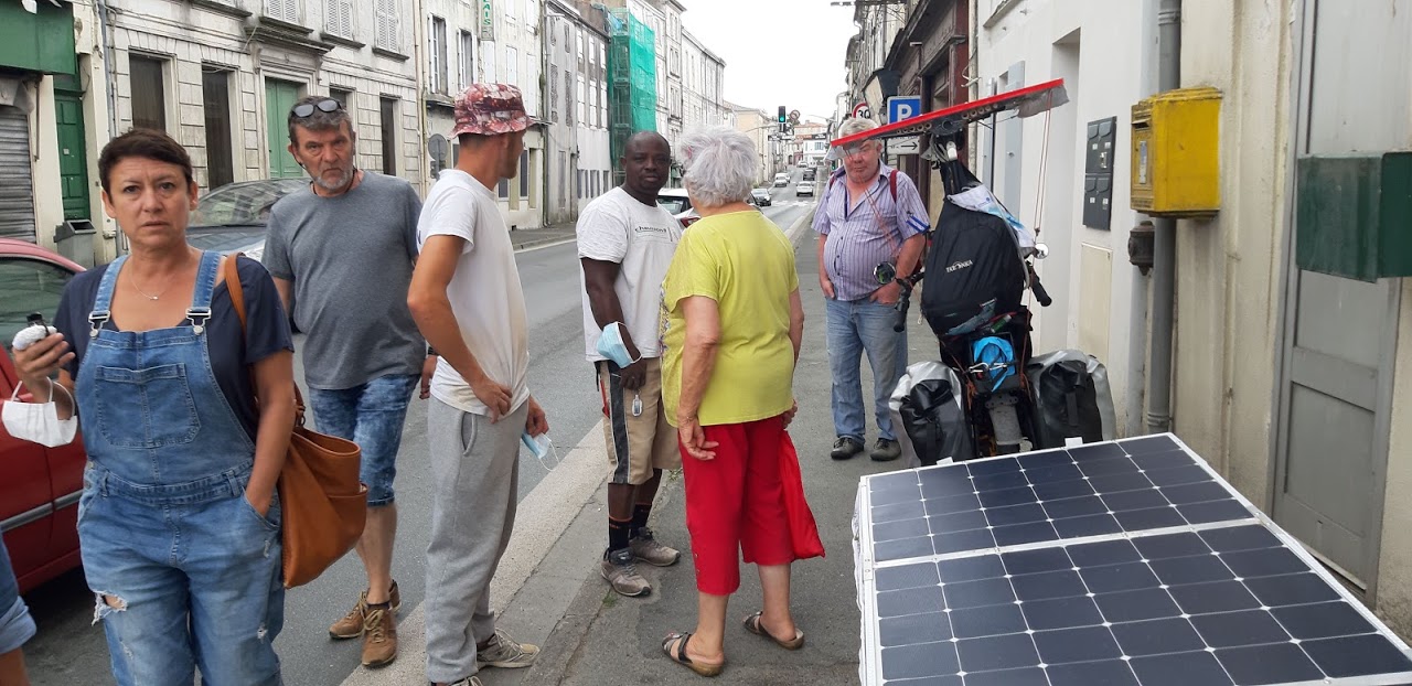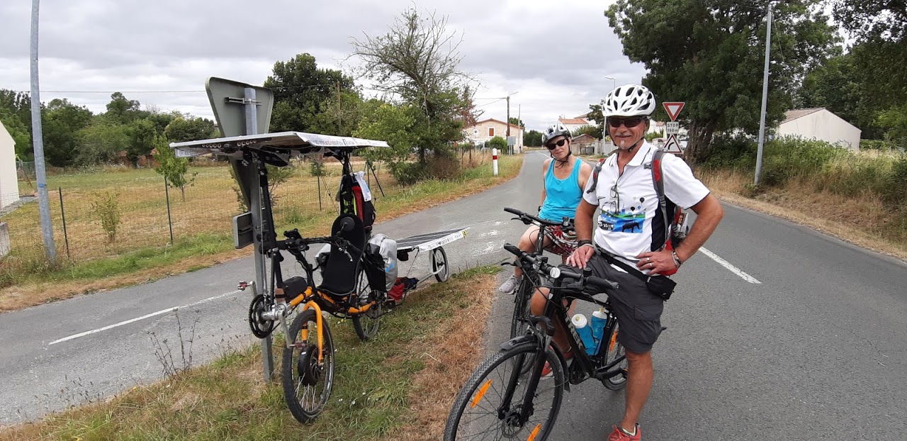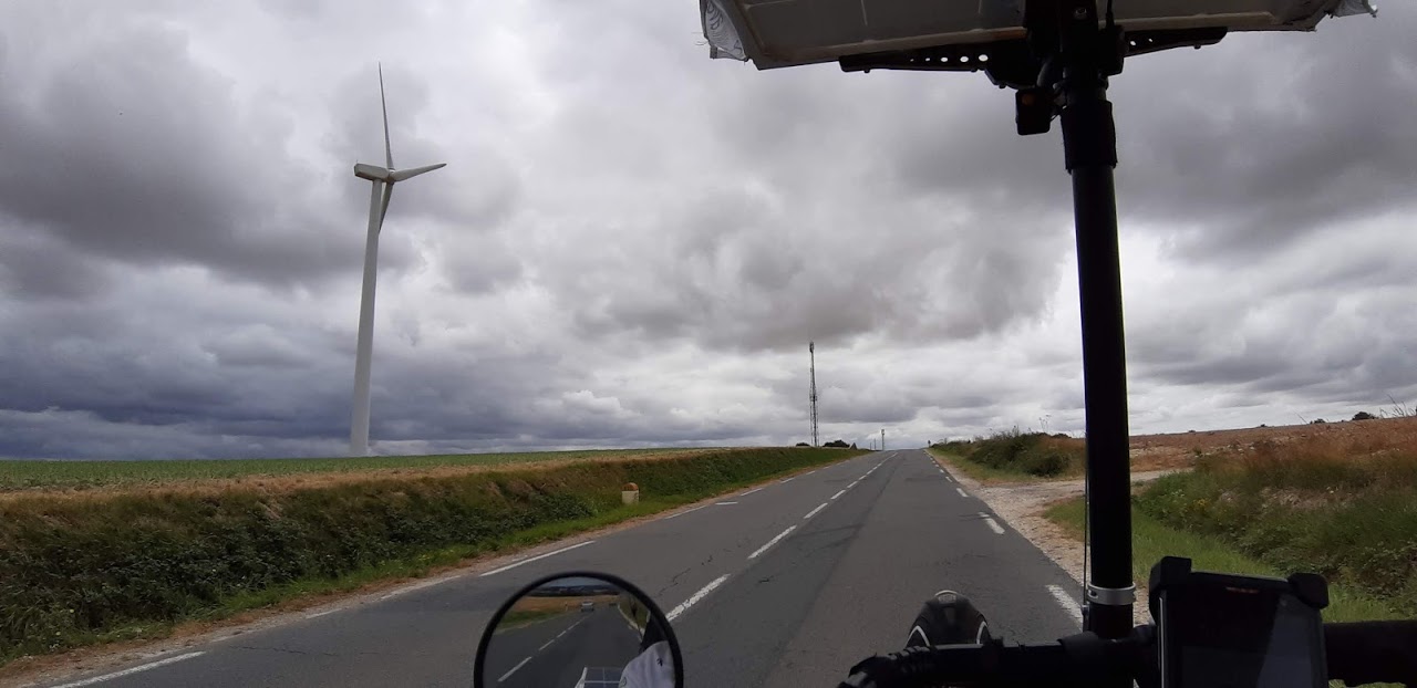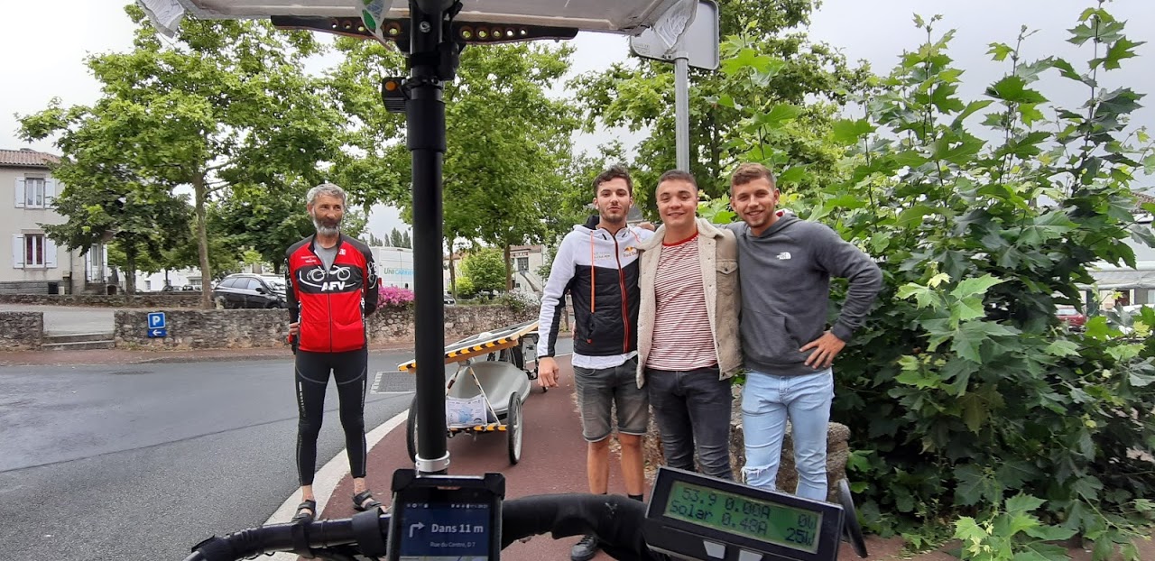 A Bournezeau, la pluie s’annonce. Christian s’est arrêté au café du village, nous discutons avec 3 jeunes et un adjoint au maire. La pluie n’insiste pas, nous repartons. Mais les nuages nous accompagnent, la production solaire est très faible, 30W, 40W… Heureusement, le relief est plat.