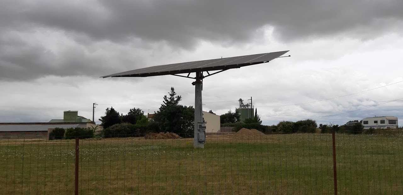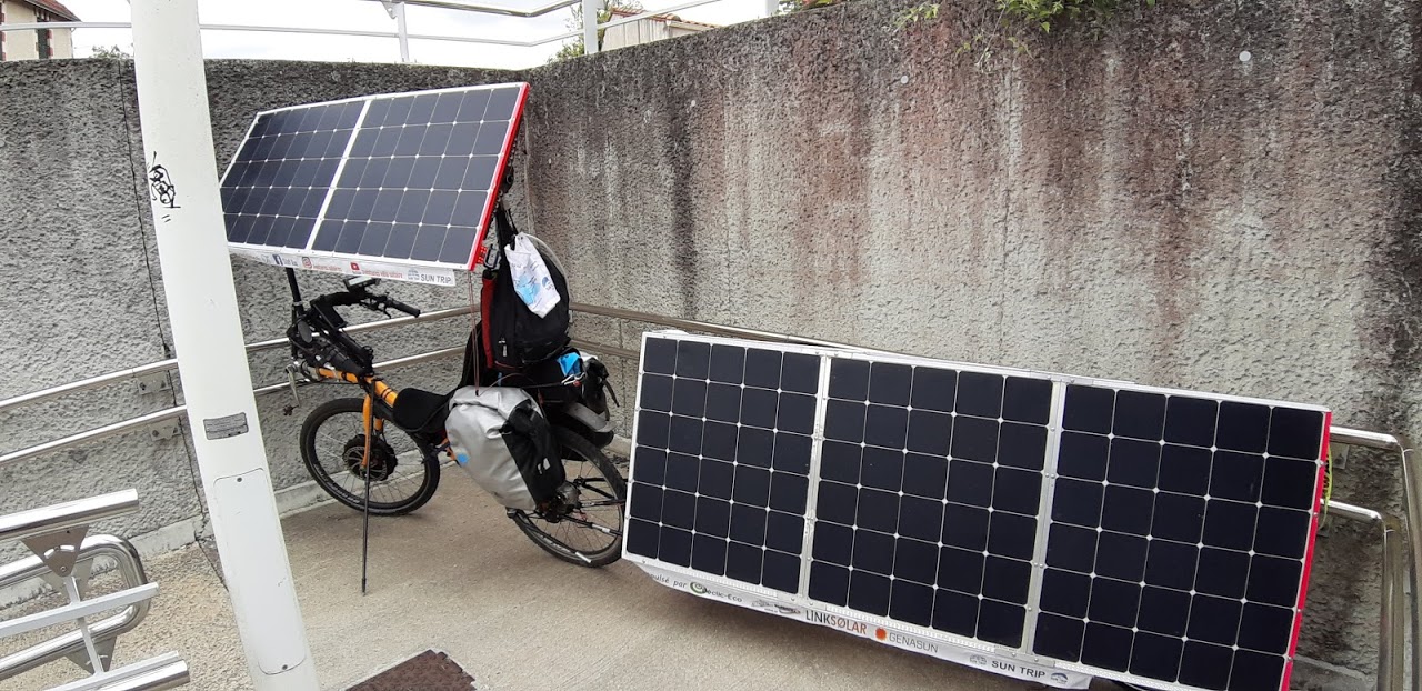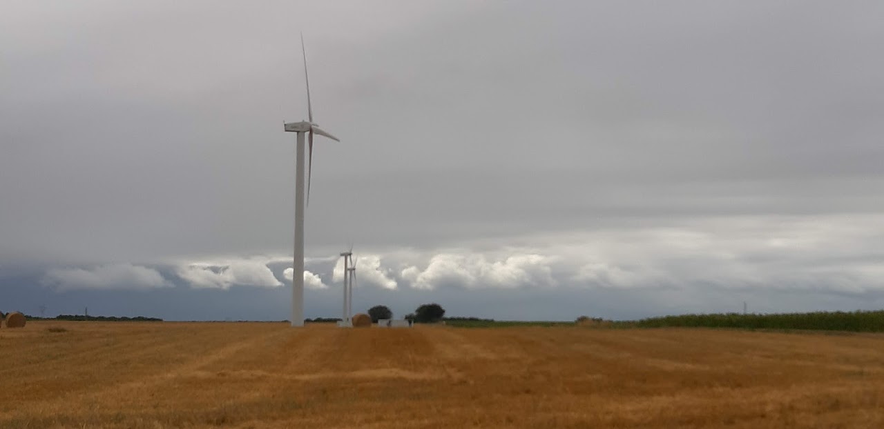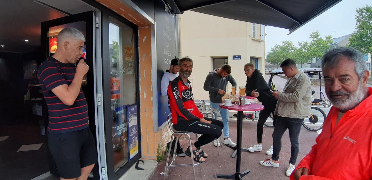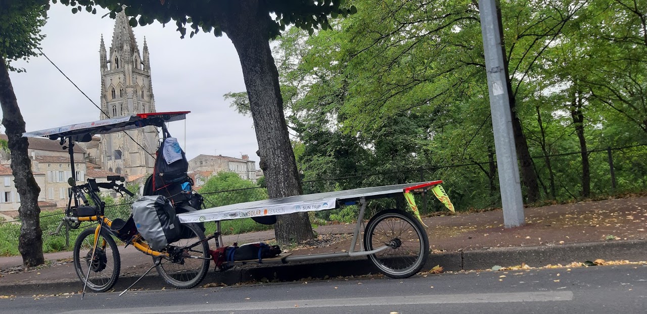 A Bournezeau, la pluie s’annonce. Christian s’est arrêté au café du village, nous discutons avec 3 jeunes et un adjoint au maire. La pluie n’insiste pas, nous repartons. Mais les nuages nous accompagnent, la production solaire est très faible, 30W, 40W… Heureusement, le relief est plat.