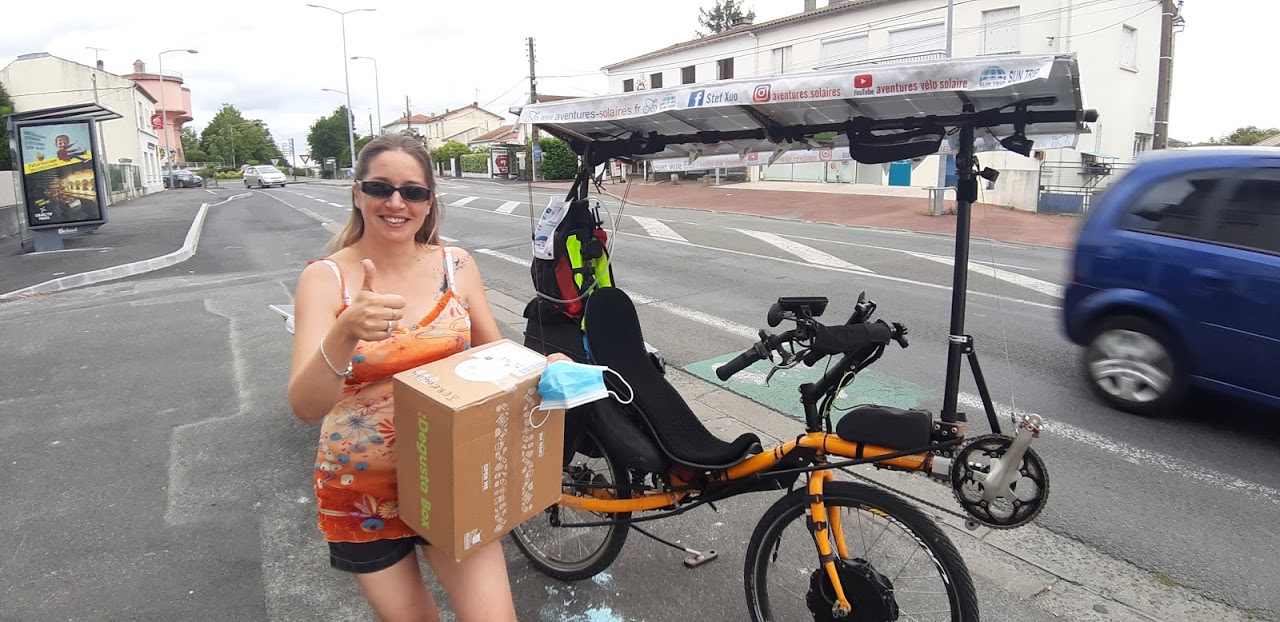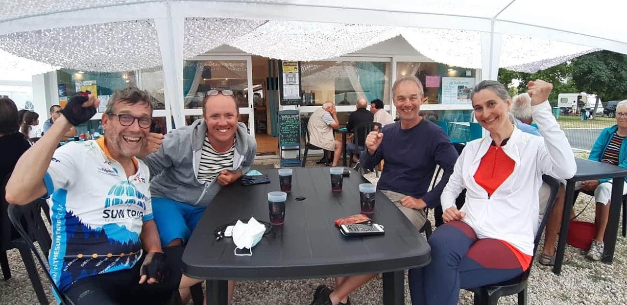 J’arrive au camping de Pons vers 20h30, je pose le vélo près de la terrasse du restaurant. On me hèle, je me retourne et surprise, c’est Cécile, et Victor et Florian sont attablés plus loin. Quel plaisir de se retrouver et de dîner ensemble. C’est ça, la magie du Sun Trip !