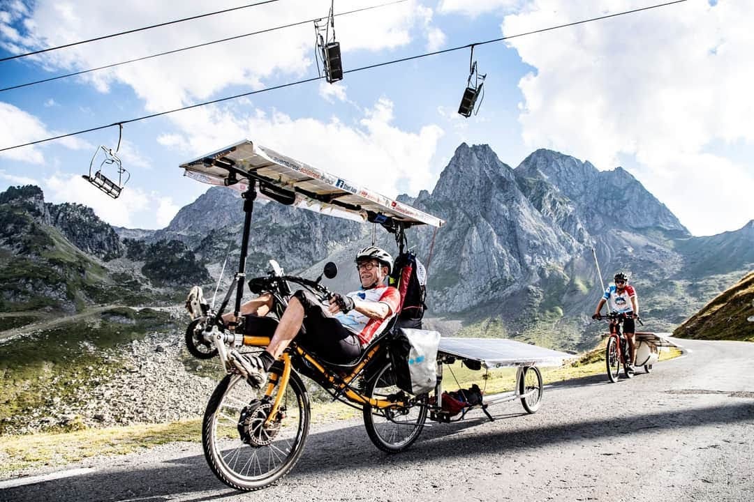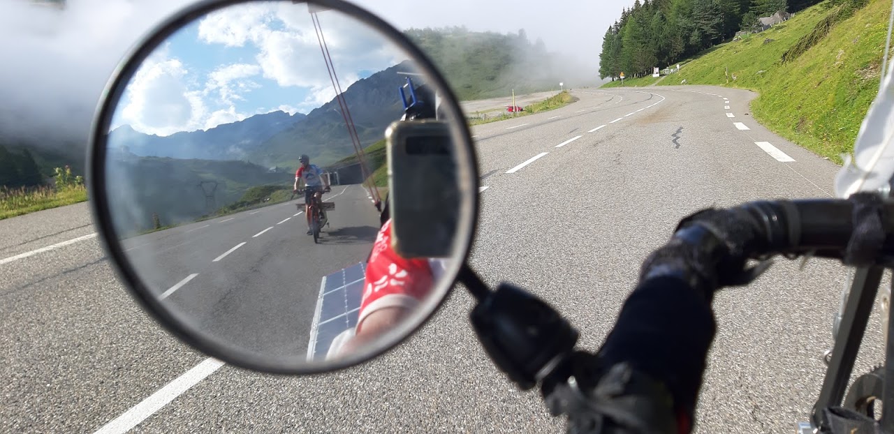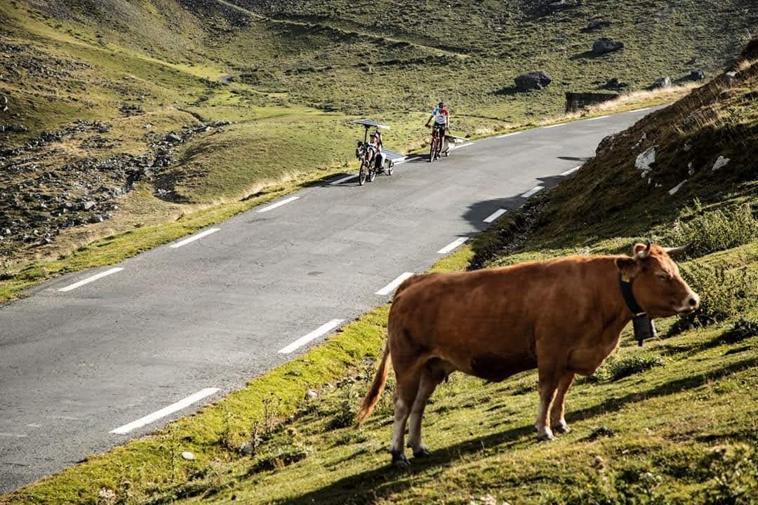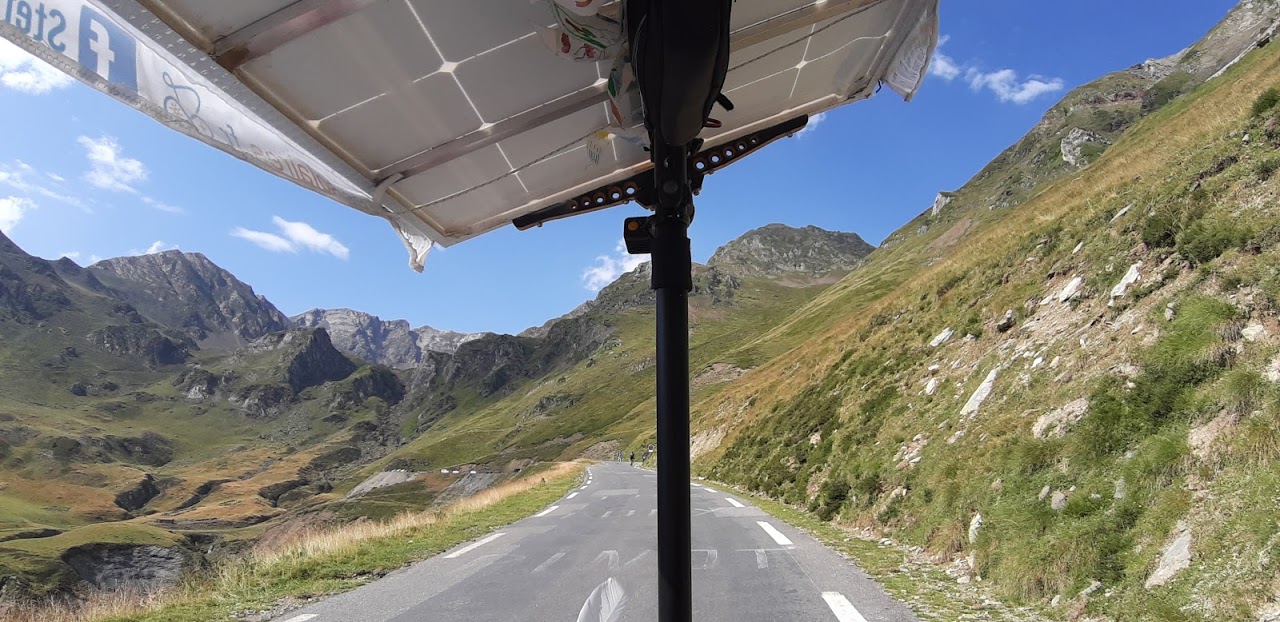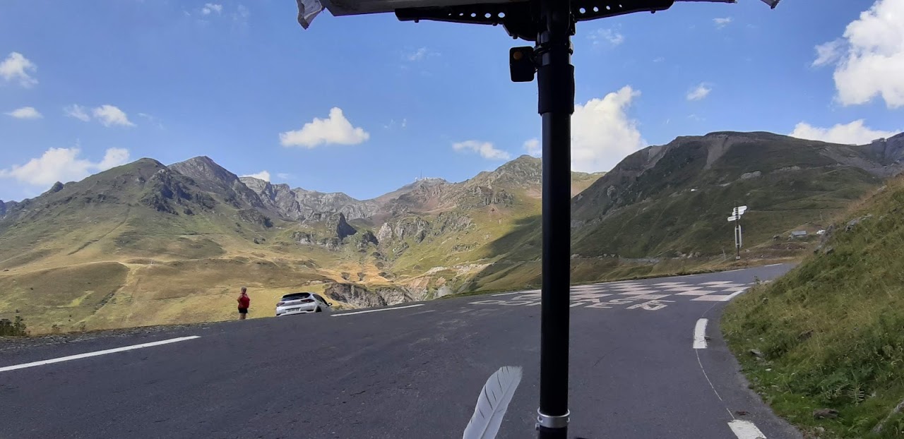 L’après-midi est très avancée, il fait très chaud. À Barèges, je rattrape Johan et Léon. La montée est raide et Johan me dit que son moteur est déjà à 110°C. Ce n’est pas bon signe car nous ne sommes qu’au début de l’ascension. Il est lourdement chargé avec sa carriole, mais elle est indispensable pour les siestes de Léon. Johan devra s’arrêter souvent pour faire refroidir son moteur.