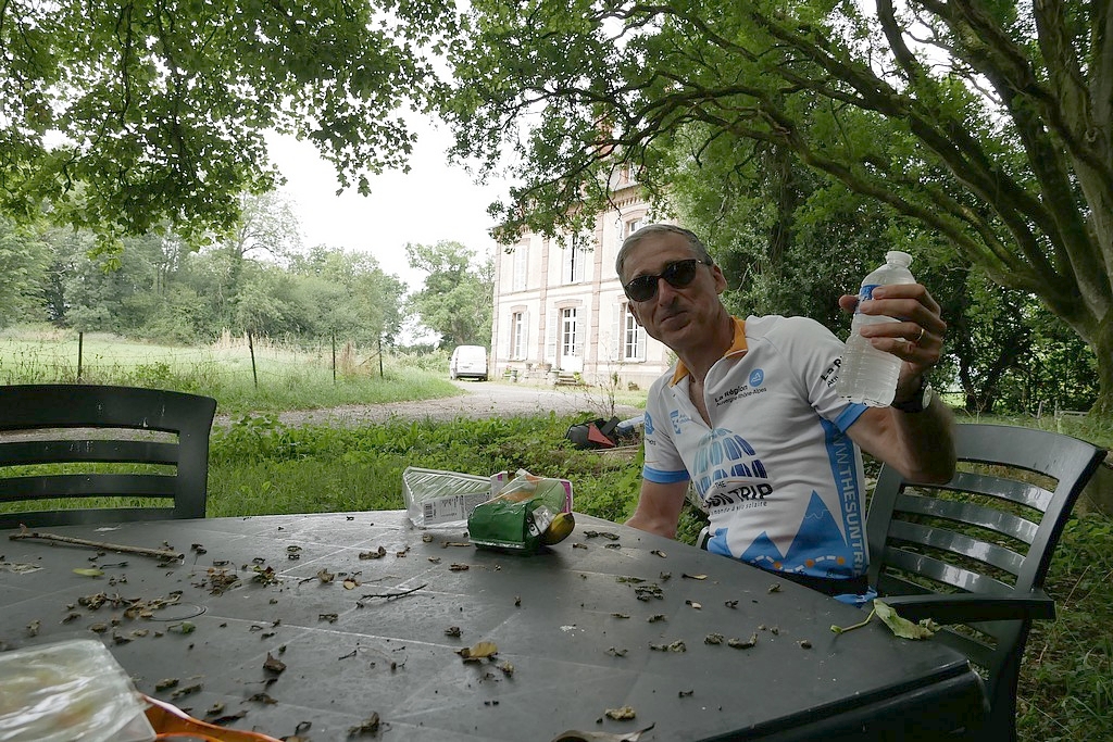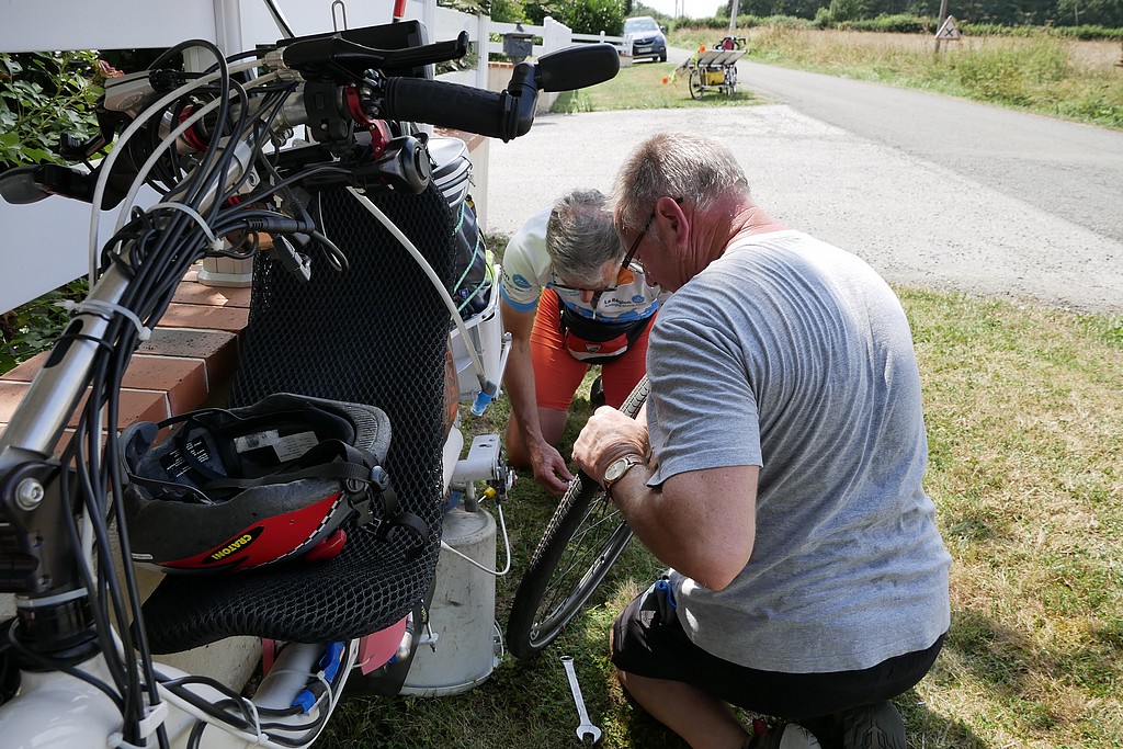 Départ matinal pour une longue journée qui devrait nous mener à destination : nous traversons de grandes forêts bien fraîches, sur des routes qui avalent collines et vallons, les fougères nous accompagnent le long des sous-bois. Nous perdons notre chemin, nous naviguons au travers du bocage sur des routes de campagne. Bientôt, les freins de Daniele se dévissent, il faut resserrer des boulons cachés derrières ses roues. Il fait appel à un habitant du petit village que nous traversons qui heureusement à tous les outils nécessaires.