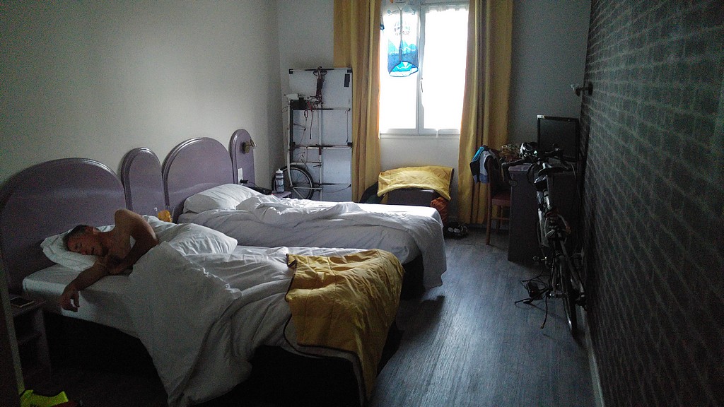 Il est 8h30 quand nous arrivons à Houdan, nous abandonnons l’idée d’arriver ce soir à notre destination finale. Pas de camping et le seul hôtel de la ville affiche complet ! Mais nous sommes soulagés d’apprendre qu’il reste malgré tout une chambre libre. Ouf, nous ne dormirons pas sans douche !